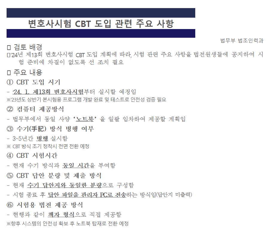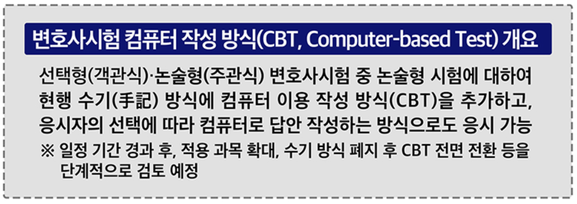 법무부에서는 현재 종이시험지에 수기로 답안지를 작성하는 PBT 방식 변호사시험에 컴퓨터 작성방식인 CBT(Computer-based Test) 도입을 추진하고 있는데요. 빠르면 2024년부터 제13회 변호사시험부터 CBT 방식이 적용될 예정이라 2023년도 제12회 시험에서는 기존의 방식대로 시험이 시행됩니다.