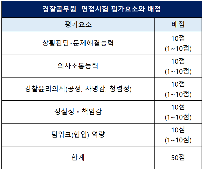 기존에는 경찰공무원 면접시험을 '의사발표의 정확성과 논리성 및 전문지식'과 '품행ㆍ예의, 봉사성, 정직성, 도덕성ㆍ준법성'의 2가지 평가요소로 구분하여 각각 10점을 배점하고 20점 만점(+ 5점 자격증 가산점) 기준으로 평가를 했었는데요.