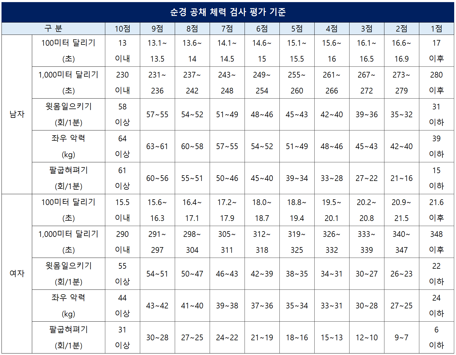 순경 공채 체력 검사는 100m 달리기, 1,000m 달리기, 윗몸일으키기, 좌우 악력, 팔굽혀펴기의 5가지 종목을 평가하는데요. 각 종목마다 평가 기준표에 따라 1점에서 10점의 점수를 부여합니다.