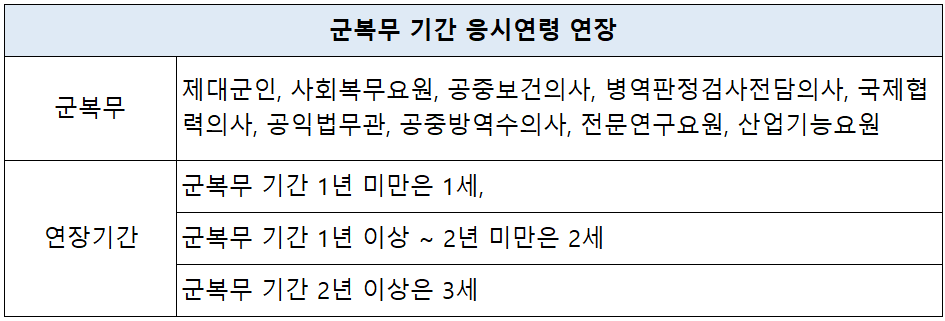 또한, 군복무군 복무 기간으로 인해 응시연령을 초과한 사람은 응시 연령이 연장되는데요. 군 복무로 인정되는 경우는 아래 표와 같이 군 제대, 사회복무요원, 공익법무관, 산업기능요원 등이 있습니다.