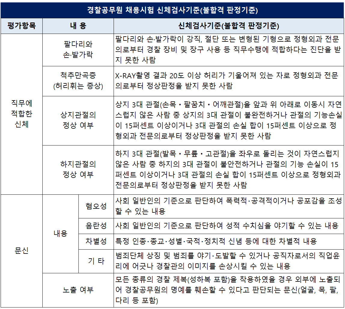 | 문신 | 내용 및 노출 여부에 따라 경찰공무원의 명예를 훼손할 수 있다고 판단되는 문신이 없어야 한다. |