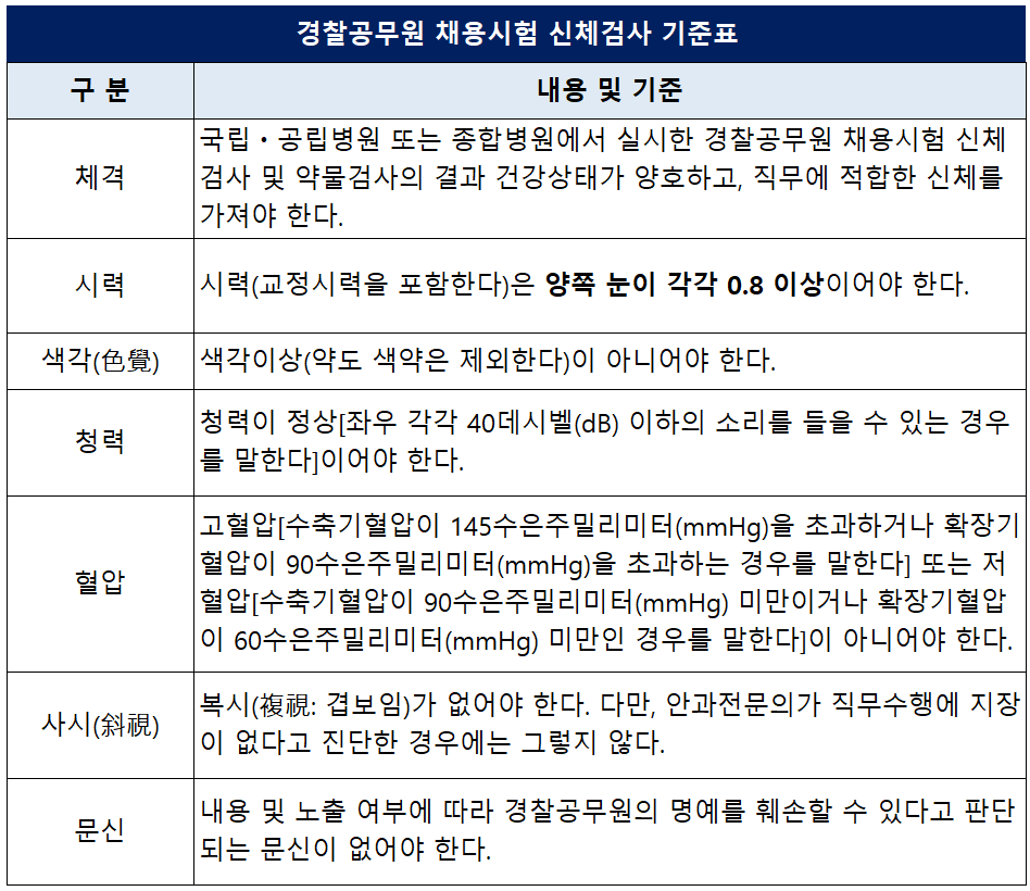 신체조건 부합 여부는 1차 필기시험 합격자를 대상으로 합니다. 경찰공무원 채용 필기시험 합격자는 반드시 국립·공립병원 또는 종합병원에서 실시한 '경찰공무원 채용 신체 검사서'를 제출해야 하고, 그 검사서를 기초로 위 '경찰공무원 신체검사 기준표' 및 '경찰공무원 채용시험 신체검사 기준'에 부합하는지를 판단하는데요. 위 신체검사기준 중에서 하나 이상 해당되는 경우에는 신체검사에 불합격한 것으로 봅니다.
