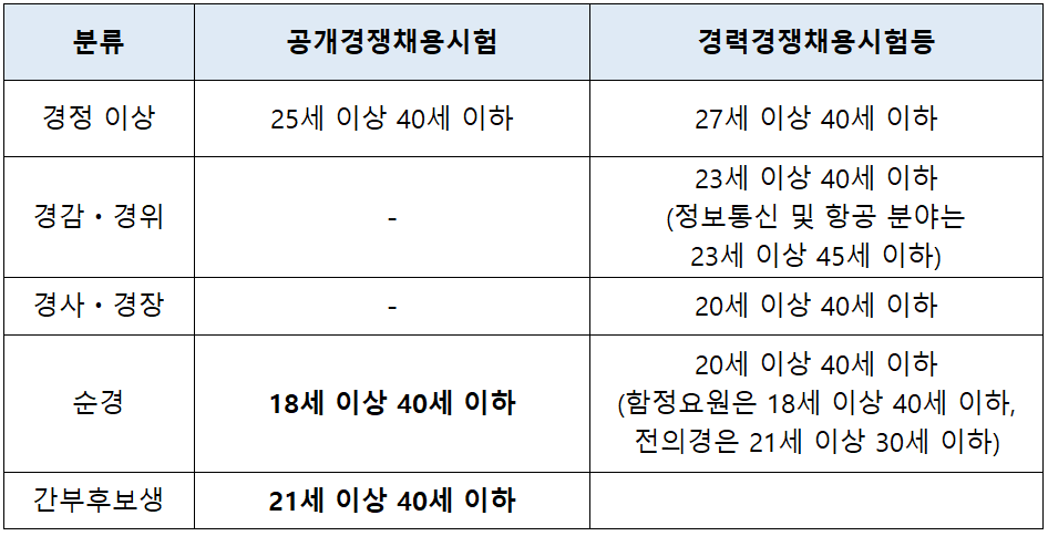 | 순경 | 18세 이상 40세 이하 | 20세 이상 40세 이하 (함정요원은18세이상40세이하, 전의경은21세이상30세이하) |