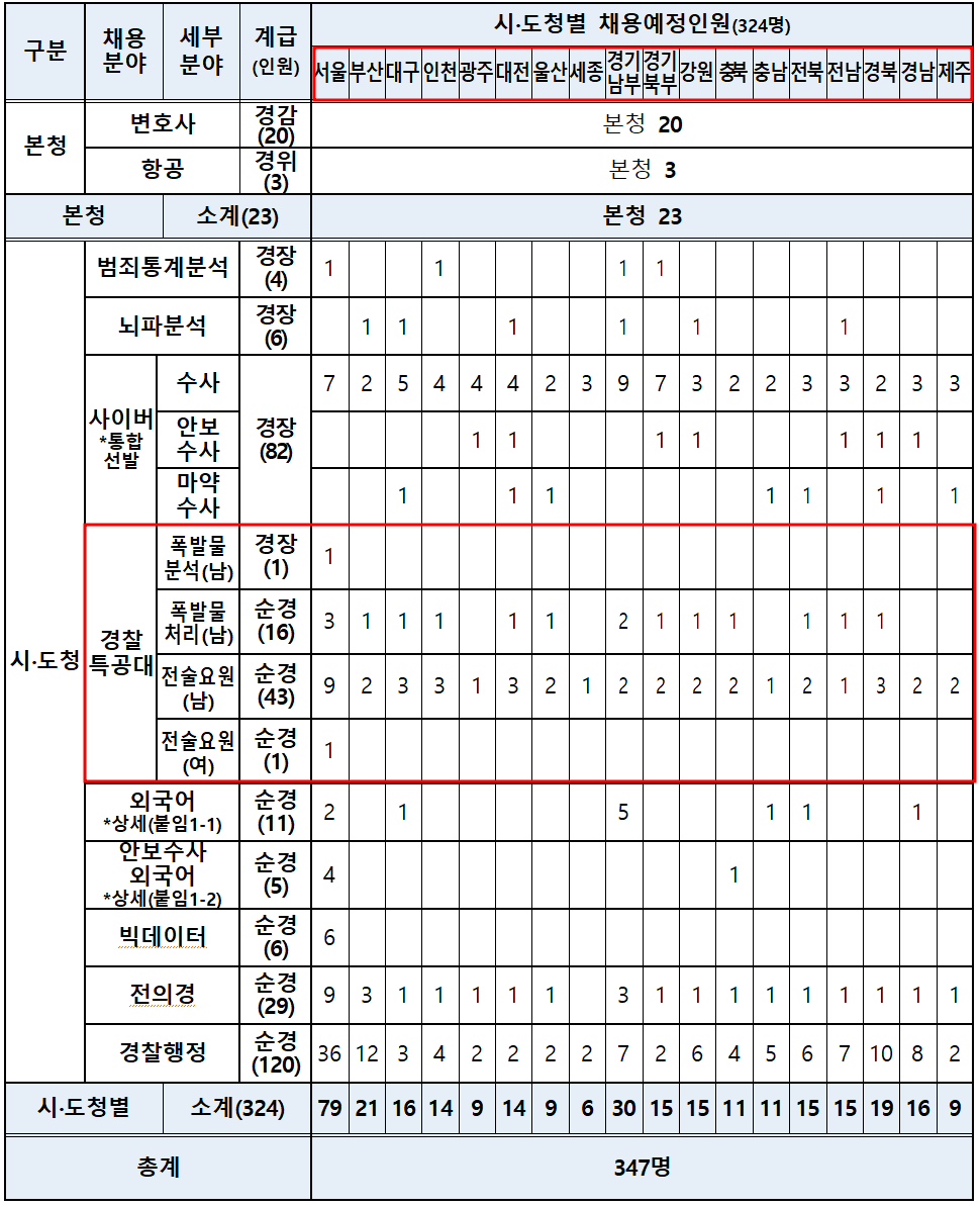 경찰특공대는 시·도 경찰청 구분 모집을 하지 않고 경찰청에서 통합 선발한 후 신임 교육을 거쳐 임용시 아래 표에 해당하는 경찰청 티오를 고려하여 교육성적순으로 희망지를 배치합니다.