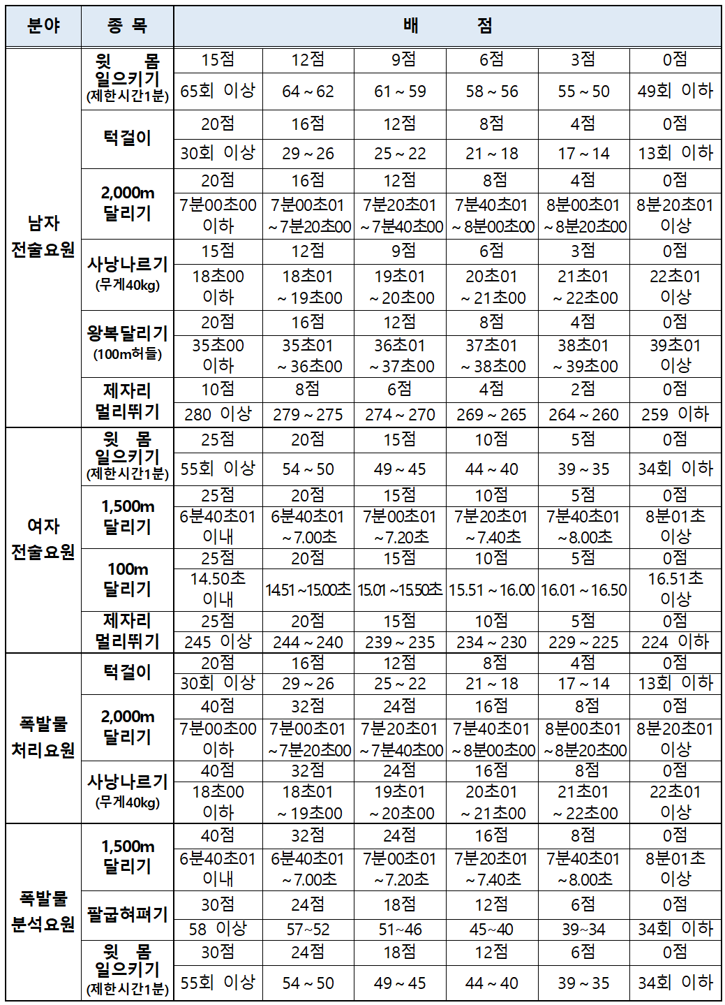 경찰특공대 체력검정은 아래 표와 같이 채용분야에 따라 종목과 배점이 다릅니다.