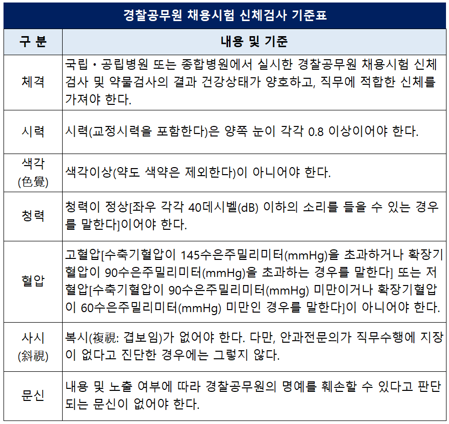 1차 시험 합격자가 제출한 '경찰공무원 채용 신체검사서'를 토대로 아래 경찰공무원 채용시험 신체검사 기준표와 신체검사 세부기준을 모두 충족해야만 신체검사 합격 결정을 합니다.