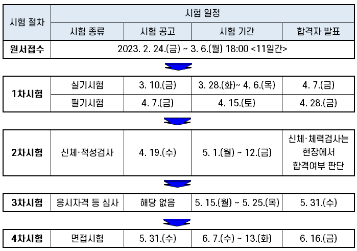 아래 표는 2023년 경찰특공대 채용 시험 일정인데요. 1차 실기 및 필기시험, 2차 신제 및 적성 검사, 3차 응시자격 등 심사, 4차 면접시험을거쳐 합격자를 결정합니다. 지금 부터 각 단계별 시험 방법과 합격 기준 등에 대해서 자세히 살펴보도록 하겠습니다.