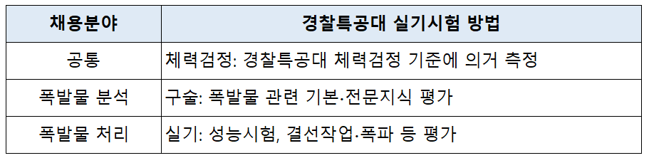 경찰특공대 실기시험은 모든 분야 공통으로 체력 검정을 평가하고, 폭발물 분석(경장) 분야는 폭발물 관련 기본전문지식을 평가하는 구술 시험을 보며, 폭발물 처리(순경) 분야는 성능시험, 결선작업·폭파 등을 평가하는 실기시험을 봅니다.