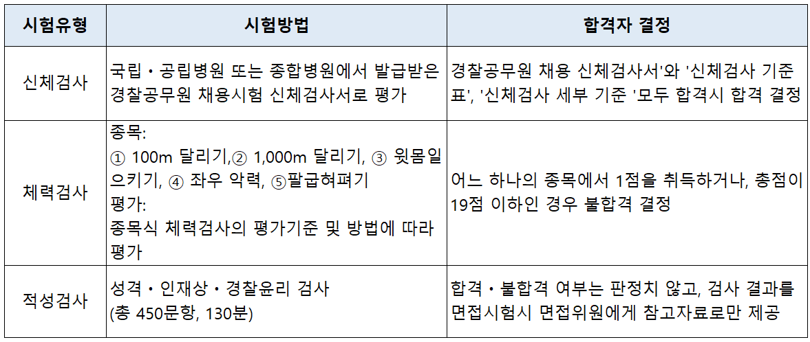 경찰특공대 신체·체력·적성검사의 시험 방법과 합격자 결정은 아래 표로 정리했습니다.