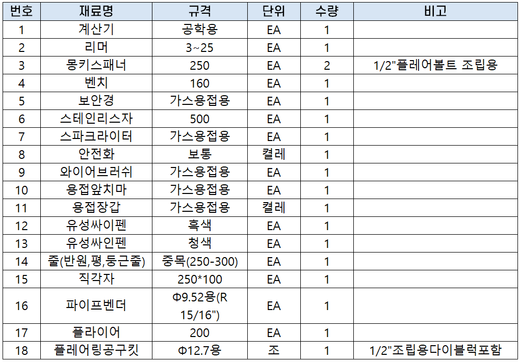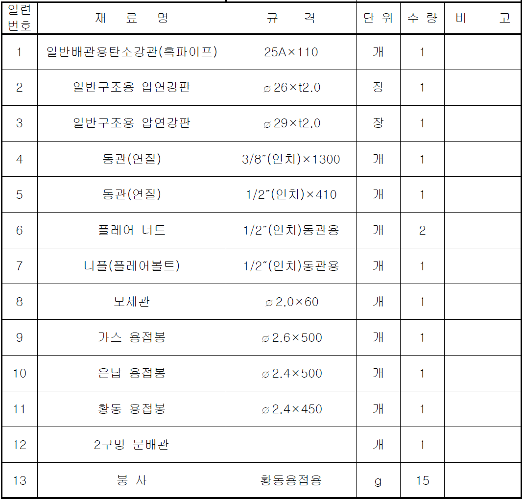동관 작업은 아래 표와 같이 지급된 재료를 사용하여 주어진 도면과 같은 배관작업을 시행하고 2시간 내에 결과물을 제출해야 합니다.