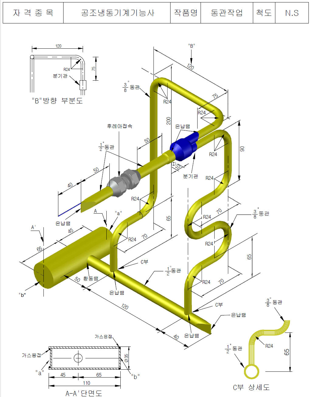 동관 작업형은 주어진 재료를 활용하여 도면과 같이 작품을 제작하는 능력을 평가하는 작업형 시험 시간은 약 2시간, 필답형 시험 시간은 1시간 입니다.