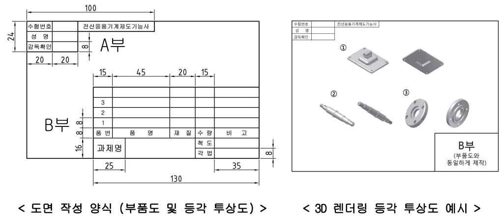 전산응용기계제도기능사 실기시험은 지급된 재료 및 시설을 사용하여 부품도(2D)와 렌더링 등각 투상도(3D) 등을 제도하는 작업형으로 출제되는데요.