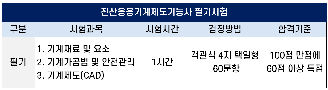 필기시험과목은 ①기계재료 및 요소, ② 기계가공법 및 안전관리, ③ 기계제도(CAD)의 3과목으로 구성됩니다. 과목별 세부 출제기준은 하단에 첨부한 파일을 보시기 바랍니다.