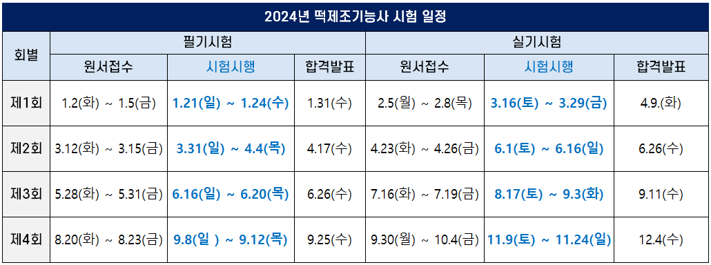 2024년에 시행되는 떡제조기능사 필기 시험일, 원서접수기간, 합격자 발표일 등 시험 일정은 다음과 같습니다(모바일 환경에서 표가 깨져 보이는 경우 아래 그림을 보세요).