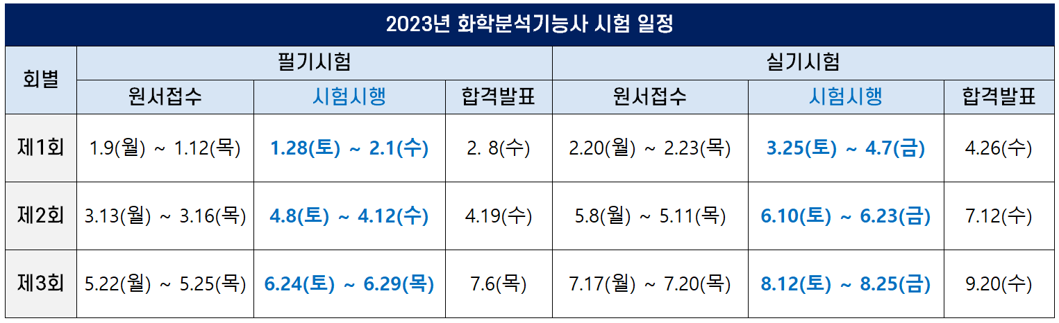 2023년에 시행되는 화학분석기능사 필기 시험일, 원서접수기간, 합격자 발표일 등 시험 일정은 다음과 같습니다(모바일 환경에서 표가 깨져 보이는 경우 아래 그림을 보세요).