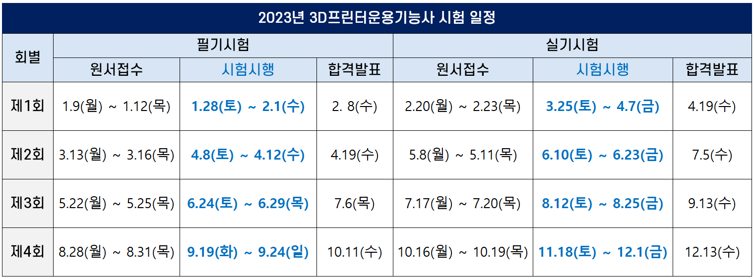 2023년에 시행되는 3D프린터운용기능사 필기 시험일, 원서접수기간, 합격자 발표일 등 시험 일정은 다음과 같습니다(모바일 환경에서 표가 깨져 보이는 경우 아래 그림을 보세요).