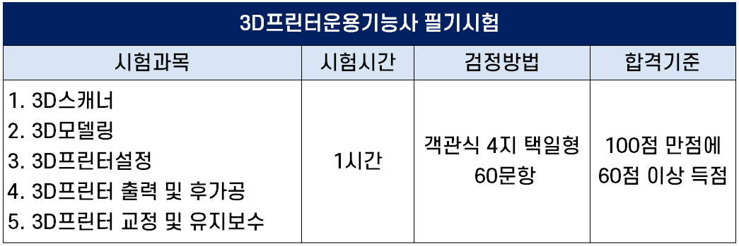 3D프린터운용기능사는 3D 프린터 기반으로 아이디어를 실현하기 위하여 시장조사, 제품 스캐닝, 디자인 및 엔지니어링 모델링, 출력용 데이터 확정, 3D 프린터 SW설정, 3D 프린터 HW설정, 제품 출력, 후가공, 장비 관리 및 작업자 안전사항 등의 직무 수행하는 자격증입니다.