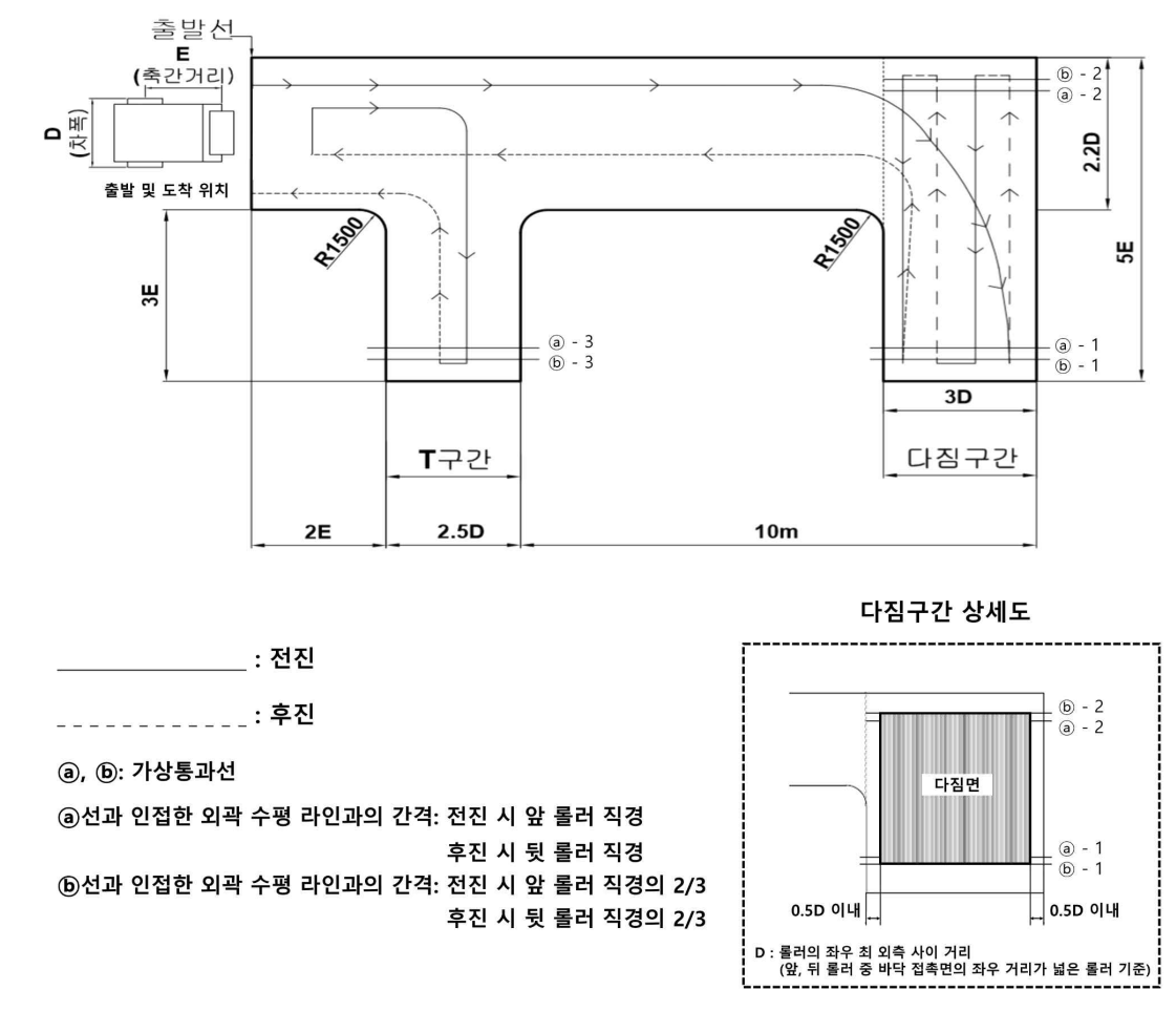 코스운전 및 다짐 작업은 아래 도면과 같이 시험장에 설치된 코스에서 시행되며 시험 시작 전에 음주측정을 합니다. 알코올 농도 0.03%이상이거나 음주측정을 거부하는 경우에는 실기시험에 응시할 수 없습니다.