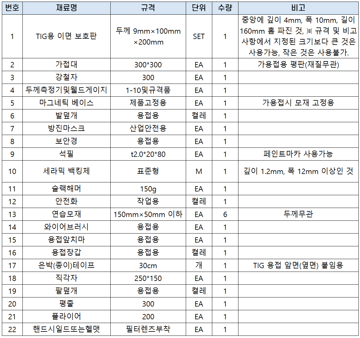 특수용접기능사 실기시험에 응시하는 수험생은 아래 지참 준비물을 규격에 맞게 준비해 가야 합니다.