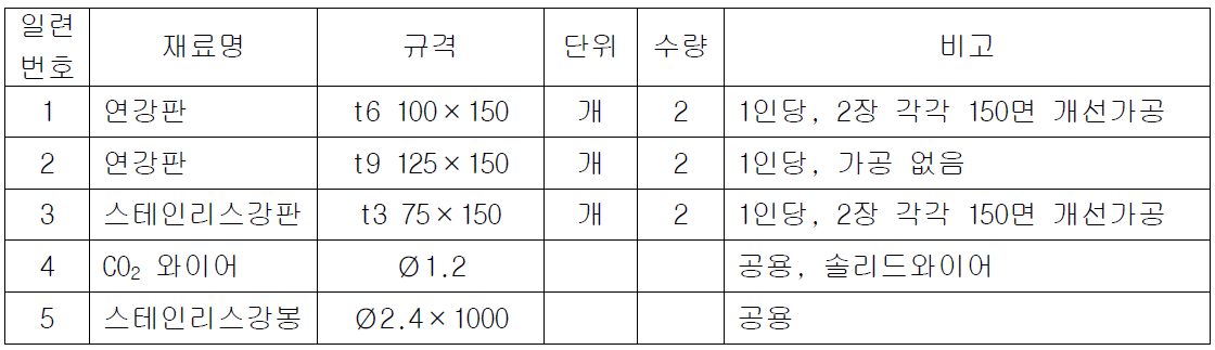작업형 실기시험은 CO2용접 맞대기 30분, CO2 용접 필릿 30분, TIG용접 40분으로 진행되며, 아래 표와 같이 지급된 재료와 도면에 따라 지시한 내용대로 용접 작업을 해야 합니다.