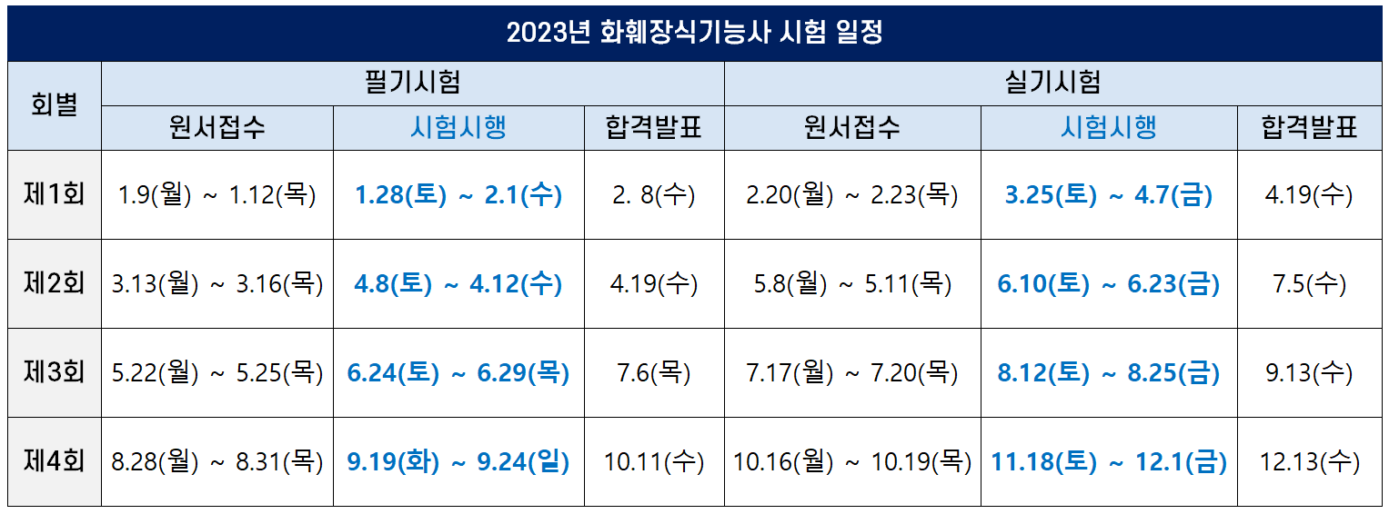 2023년에 시행되는 화훼장식기능사 필기 시험일, 원서접수기간, 합격자 발표일 등 시험 일정은 다음과 같습니다(모바일 환경에서 표가 깨져 보이는 경우 아래 그림을 보세요).