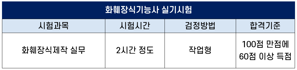 화훼장식기능사 실기시험은 주어진 재료와 요구사항에 따라 화훼 장식을 제작하는 작업형으로 출제되는데요. 시험시간은 2시간 정도이고, 100점 만점에 60점 이상 득점하면 합격입니다.