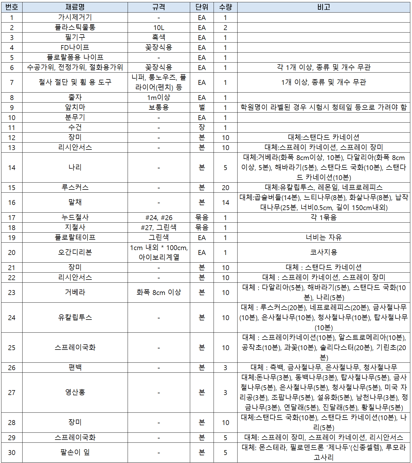 화훼장식기능사 실기시험에 응시하려는 수험생은 아래 표로 정리한 지참 준비물의 재료를 규격대로 준비해야 시험을 보는데 불이익을 당하지 않습니다.