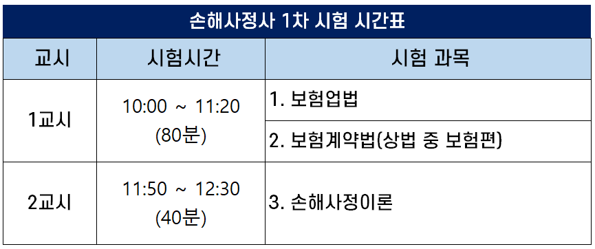 손해사정사 시험은 통상 1차 시험이 4월 하순에 2차 시험이 7월 말이나 8월 초에 시행되는데요. 매년 1월 초에 공고되는 시험 시행 공고를 통해 정확한 시험 일정을 확인할 수 있습니다.