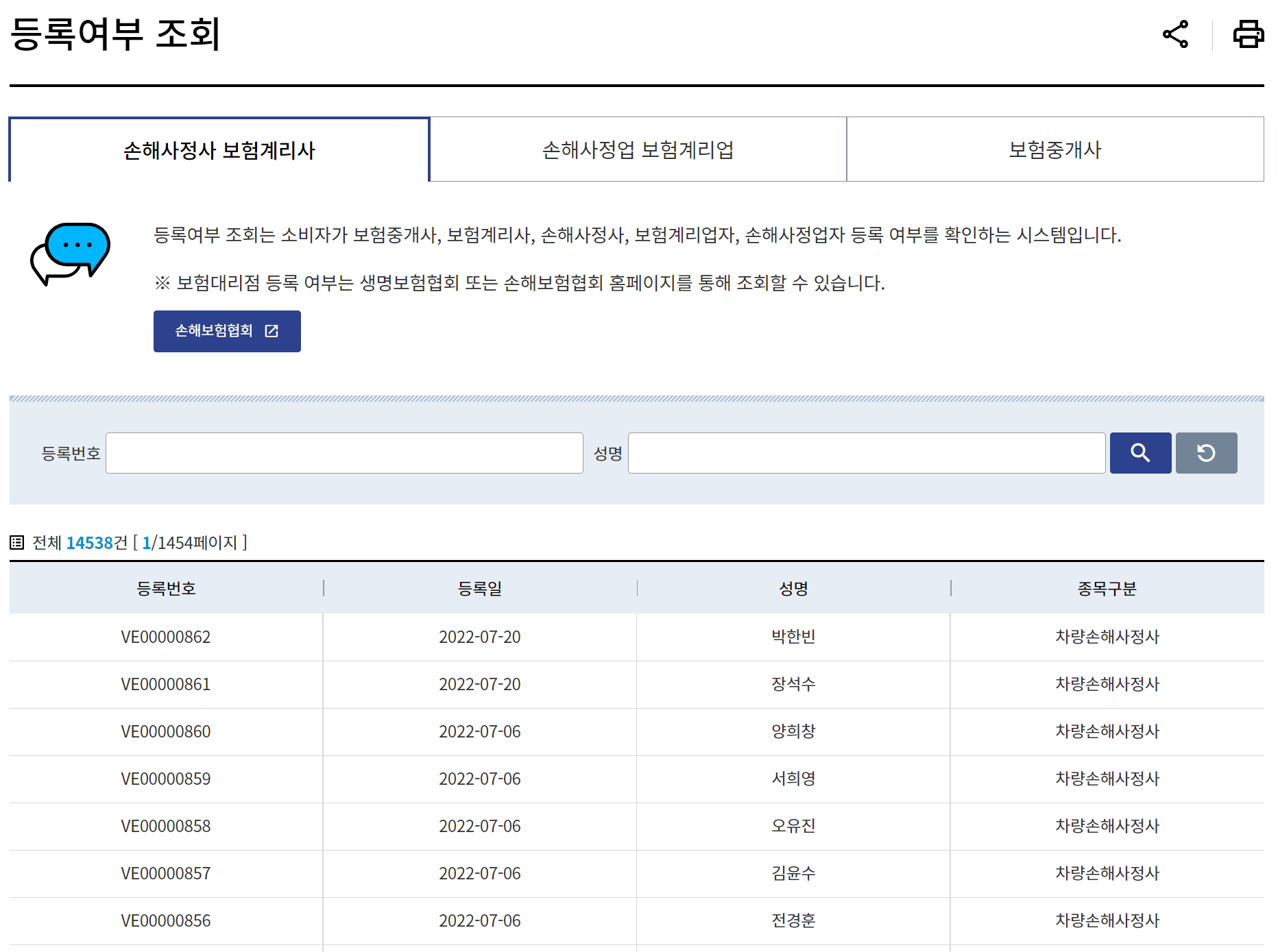 등록된 손해사정사는 금융감독원 홈페이지에서 이름과 등록번호 및 어떤 종류의 손해사정사인지 조회 가능합니다.