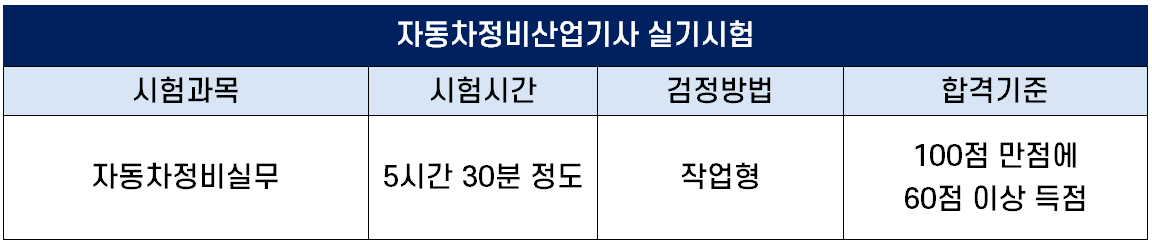 실기시험 과목은 자동차 정비실무로 지급된 재료 및 시설물을 사용하여 요구사항에 맞게 자동차 정비를 하는 작업형으로 출제되며, 시험시간은 5시간 30분 정도이고, 100점 만점에 60점 이상 득점하면 합격입니다.