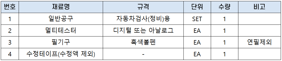 ◎ 측정기와 기타 자동차 정비에 필요한 수공구는 지참시 사용 가능하며, 모든 장비 및 지참 공구는 상용화된 정규 물품만 허용됩니다.