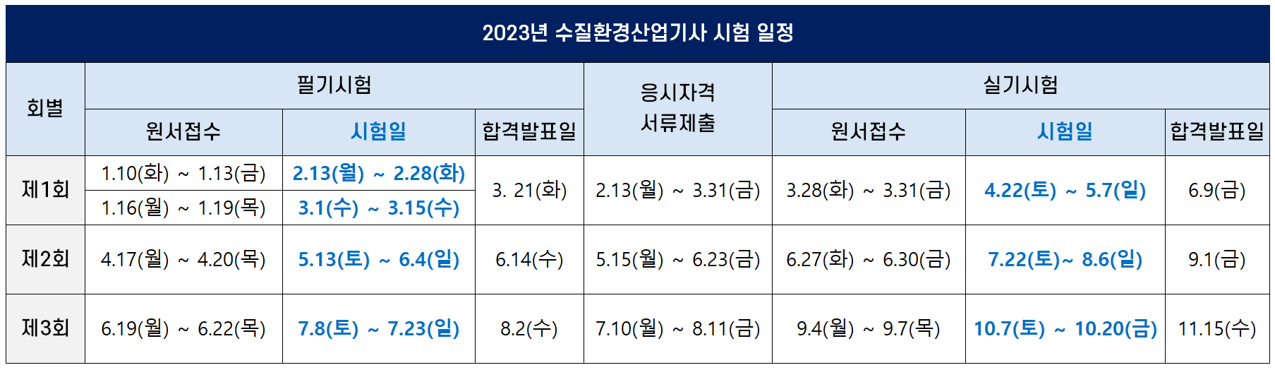 이번 포스팅에서는 2023년에 시행되는 수질환경산업기사 필기 및 실기 시험 일정을 정리했는데요. 수질환경산업기사 시험과목, 출제기준 등 필기 및 실기 시험 정보와 합격률은 아래 포스팅을 보시기 바랍니다.