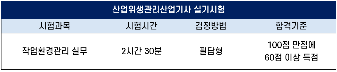 실기시험 과목은 작업환경관리 실무로 필답형으로 출제되며, 시험시간은 2시간 30분이고, 100점 만점에 60점 이상 득점하면 합격입니다.