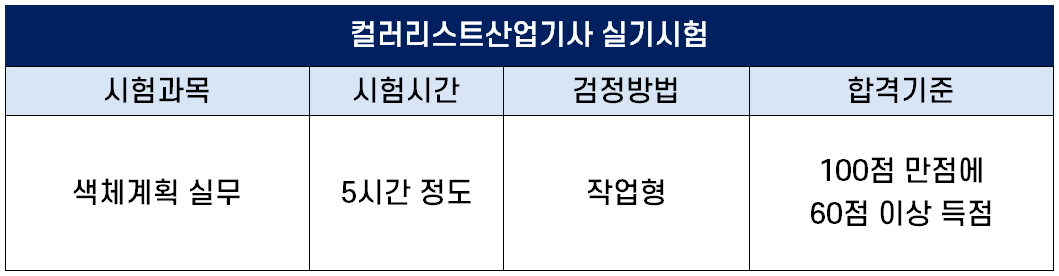 실기시험 과목은 색체계획 실무로 지급된 재료 및 시설물을 사용하여 요구사항에 맞게 색체계획을 하는 작업형으로 출제되며, 시험시간은 5시간 정도이고, 100점 만점에 60점 이상 득점하면 합격입니다.