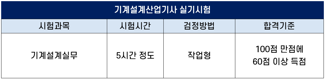 실기시험 과목은 기계설계실무로 지급된 재료 및 시설물을 사용하여 요구사항에 맞게 기계설계를 하는 작업형으로 출제되며, 시험시간은 5시간 정도이고, 100점 만점에 60점 이상 득점하면 합격입니다.