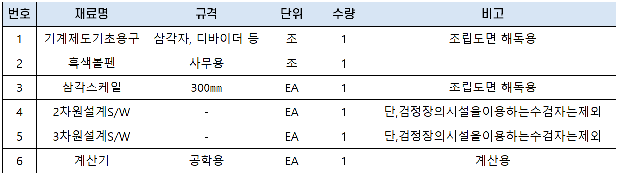 기계설계산업기사 실기시험에는 아래 지참 준비물 목록에 있는 재료를 규격에 맞게 준비해 가야 하는데요. 개인 PC를 지참할 경우에는 아래 개인PC지참 관련사항을 꼭 보시기 바랍니다.