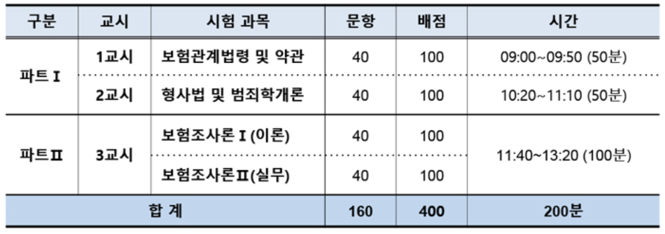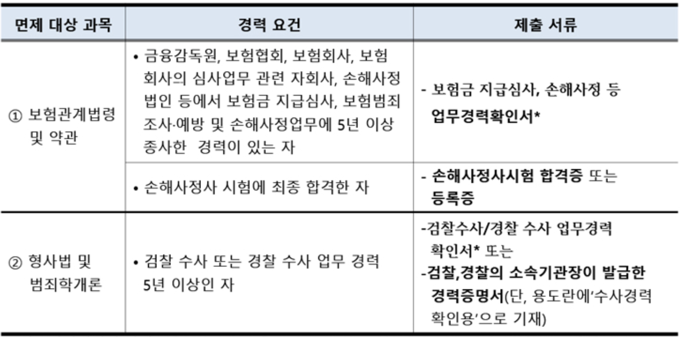※ 보험사 재직 경력 (또는 손해사정사 자격 보유자)과 수사기관 재직 경력이 모두 있더라도 파트 Ⅰ 시험 과목을 모두 면제받을 수는 없고, 응시자가 증명서류를 제출하는 단계에서 면제 희망과목을 '보험관계법령 및 약관'이나 '형사법 및 범죄학개론' 중 한 과목을 선택해야 합니다.