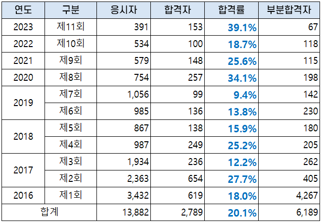 | 연도 | 구분 | 응시자 | 합격자 | 합격률 | 부분 합격자 |