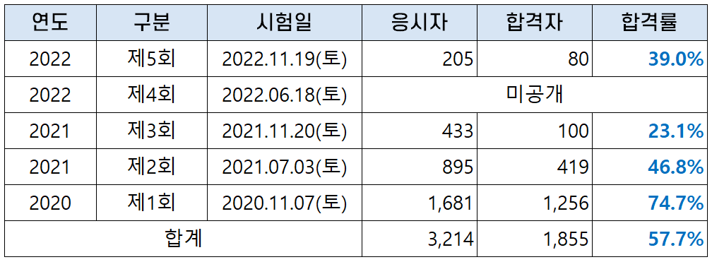 1회시험에서는 1,681명의 응시자 중 1,256명이 합격해 74.7%의 높은 합격률을 보였으나, 이후 응시자와 합격률이 하락해 2021년 제3회 시험에서는 23.1%의 합격률을 기록했습니다.
