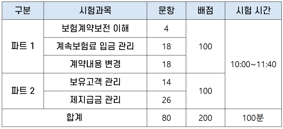 보험계약관리역 자격시험은 파트별로 40점 이상을 득점하고, 전체 평균 60점 이상 득점해야 합격입니다. 파트별 40점 미만 시 과락으로 불합격이며 부분합격은 인정하지 않습니다.