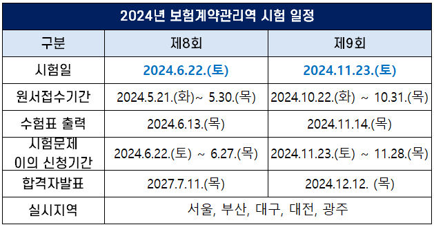 보험계약관리역 자격시험은 1년에 2회 시행되는데요. 2024년 시험 일정은 다음과 같습니다.