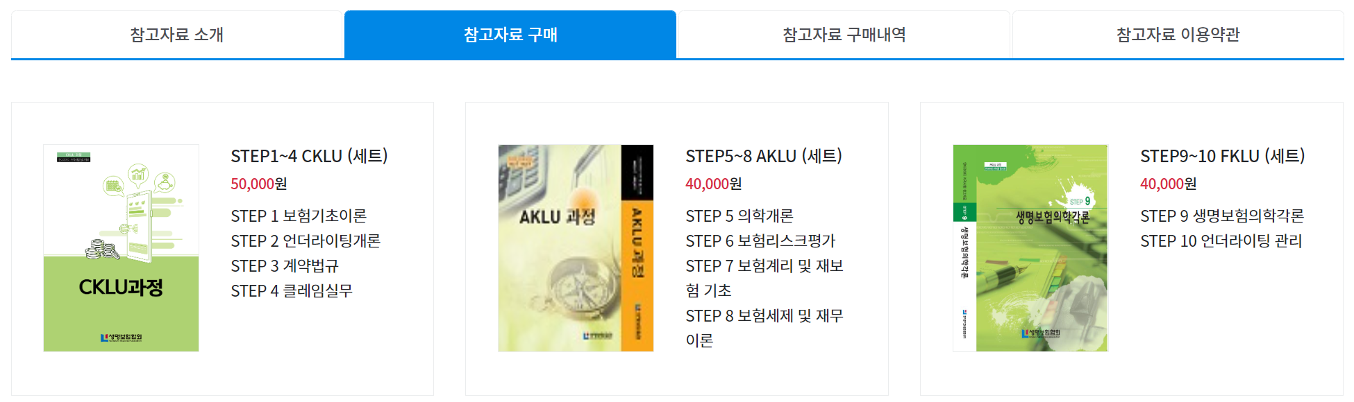 CKLU 시험문제는 생명보험협회가 발간하는 교재에서 출제되는데요. 과목별 교재 구입비는 15,000원이고 4권을 세트로 구입하면 50,000원입니다.