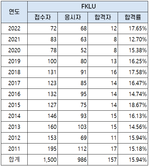 2011년부터 2022년까지 시행된 FKLU 자격시험 응시자, 합격자 및 합격률 현황을 아래 표로 정리했는데요. 평균 합격률은 15.78%입니다.
