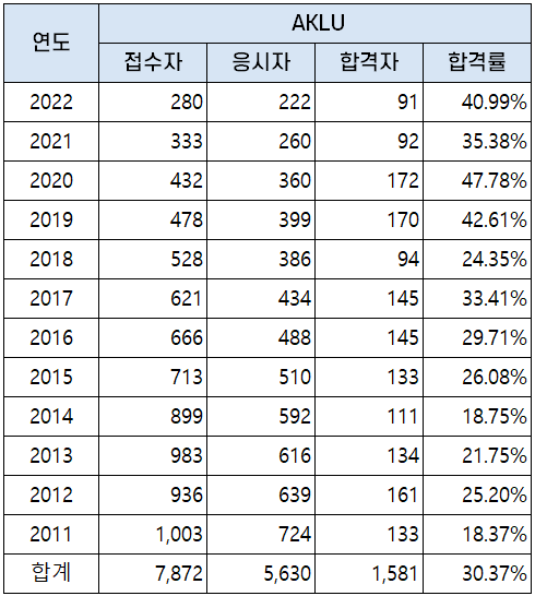 2011년부터 2022년까지 시행된 AKLU 자격시험 응시자, 합격자 및 합격률 현황을 아래 표로 정리했는데요. 평균 합격률은 30.37%입니다.