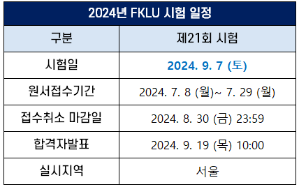 FKLU 시험은 매년 1회 시행되는데요. 2024년 시험 일정은 다음과 같습니다.