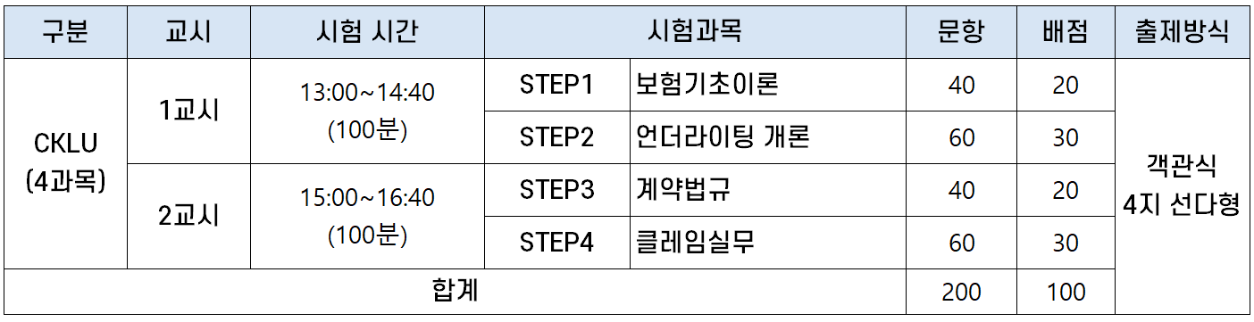 언더라이터 자격증 1단계인 CKLU 시험은 ① 보험기초이론, ② 언더라이팅 개론, ③ 계약법규, ④ 클레임실무의 4개 과목으로 구성됩니다.