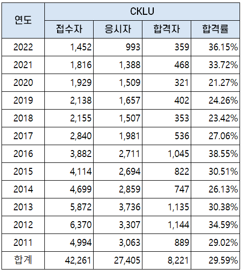 2011년부터 2022년까지 시행된 CKLU 자격시험 응시자, 합격자 및 합격률 현황을 아래 표로 정리했는데요. 평균 합격률은 29.59%입니다.