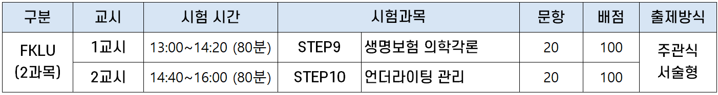 언더라이터 자격증 3단계인 FKLU 시험은 ① 생명보험 의학각론, ② 언더라이팅 관리의 2개 과목으로 구성됩니다.