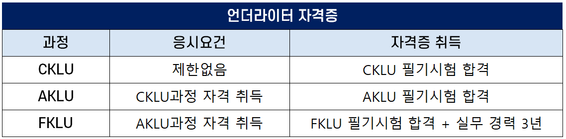 1. Certificate of Korea Life Underwriter(이하 “CKLU”라 한다) : 언더라이팅 업무에 대한 기초지식을 갖춘 자