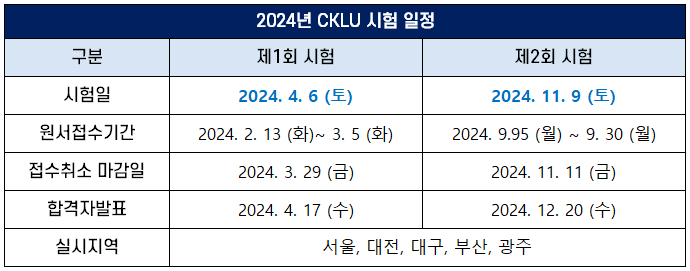 CKLU 자격시험은 1년에 2회 시행되고 있는데요. 2024년 제1회 시험은 4월 6일(토)에 시행되고, 제2회 시험은 11월 9일(토)에 시행되며, 원서접수기간 등 상세한 시험 일정은 다음과 같습니다.